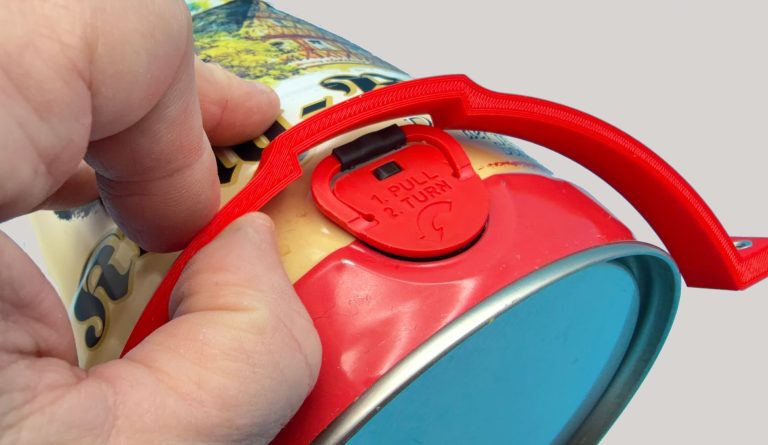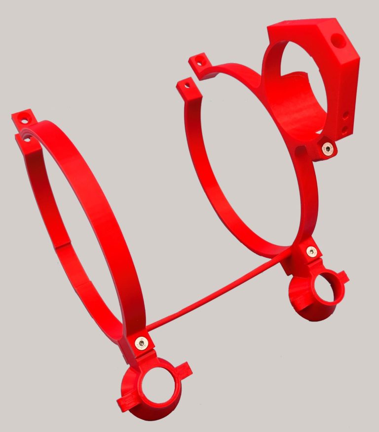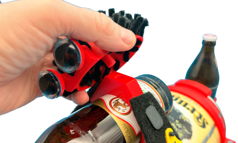 Mittels der zwei beiligenden, schwarzen Steckklammern die beiden Ohren in den beiden Bohrungen des oberen Flaschenhalters befestigen.