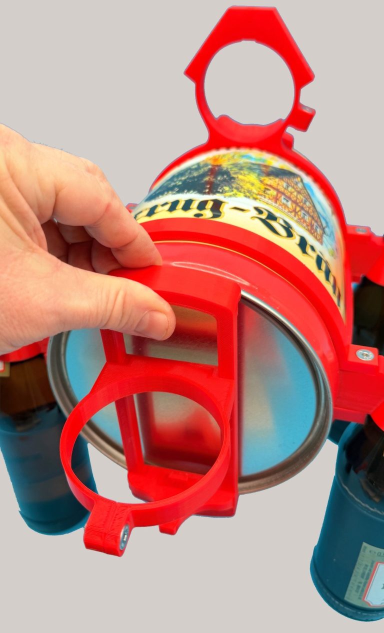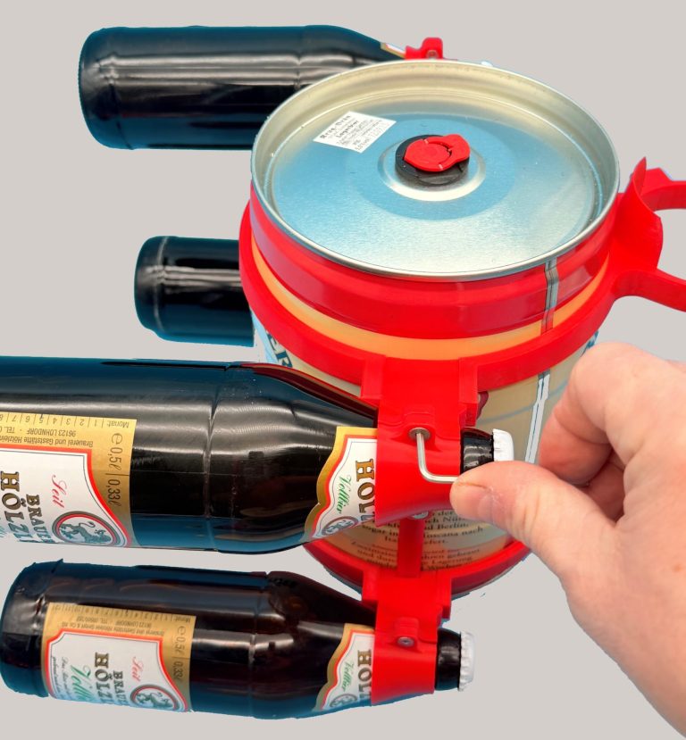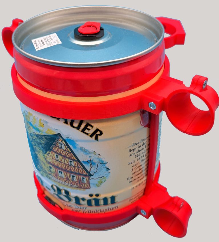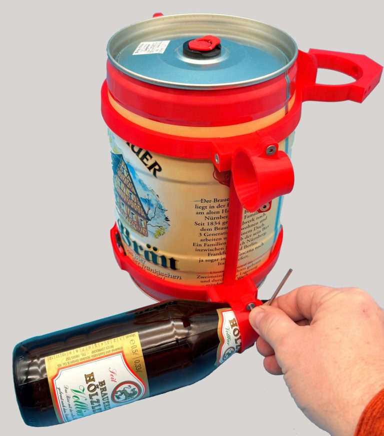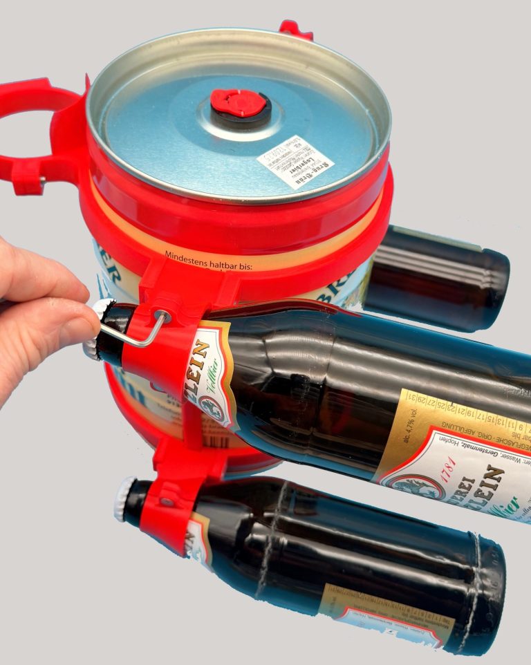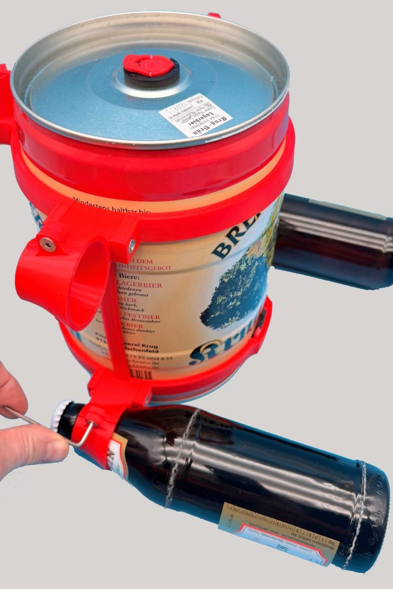 Hinteren Flaschenträger für die stehende Heckflasche auf den gekröpften Rand des Partyfasses klicken