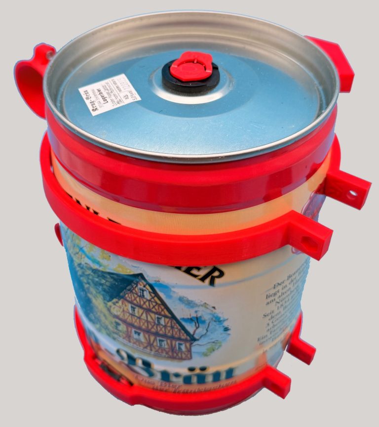 Die vormontierten Halbschalen mit den vier Flaschenhaltern über das Partyfass schieben, so dass die Schale mit der Ausklinkung hinten über dem etwas höher liegenden Luftregler des Fasses liegt.